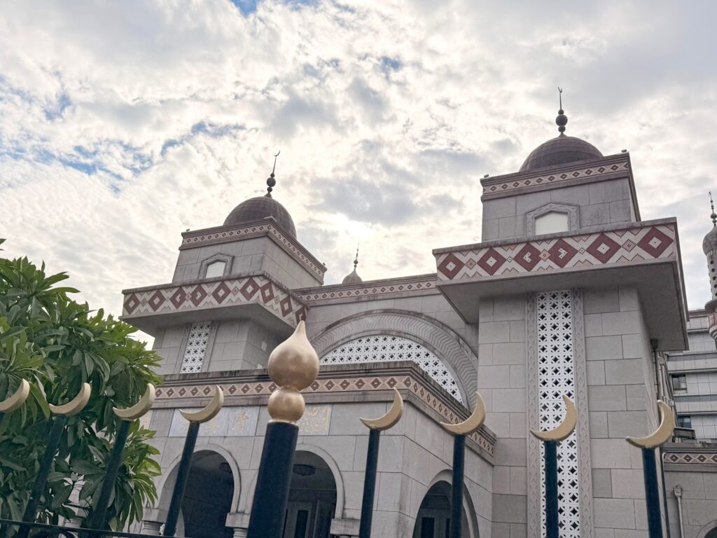 這座臺灣第一間的清真寺,安靜坐落在樹影間,外觀以灰綠色為主調,造型不繁複,卻自帶莊重氣息。最吸引目光的是兩座呈現伊斯蘭建築特色的圓頂,線條柔和,建築上幾何圖形的裝飾,以及標誌性的月亮符號,都能讓人一眼感受到「這裡屬於另一個文化」。