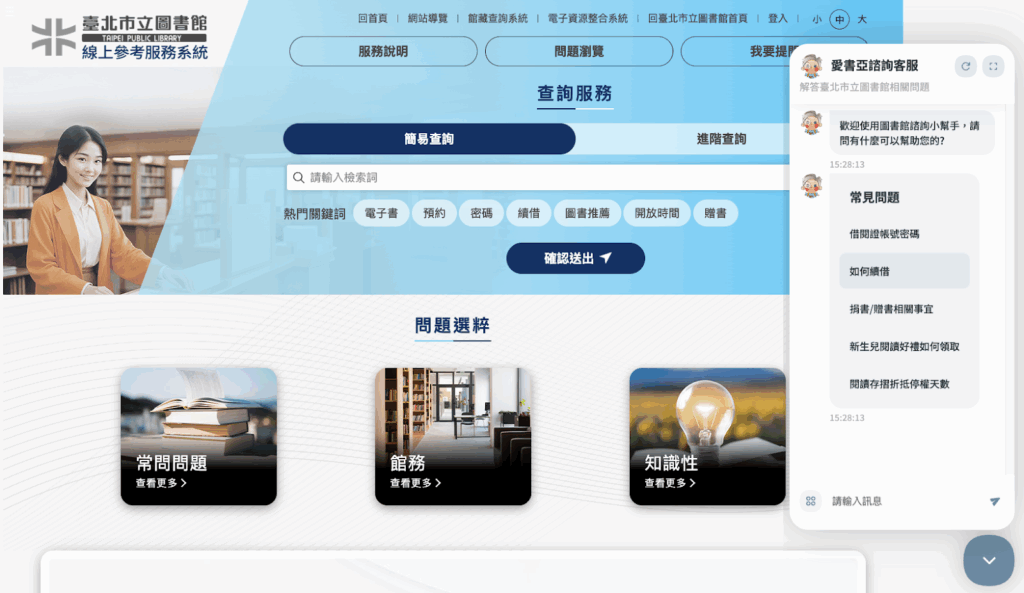 當服務對象愈趨多元,需求也變得更細碎。從開館時間、借閱規則到活動資訊,大量重複性的查詢,光是 2025 年一年就累積超過 26 萬筆問題需要回應。為了讓服務運作更順暢,北市圖近年開始導入 AI 諮詢客服「愛書亞」,協助處理這類即時、基礎的問題。